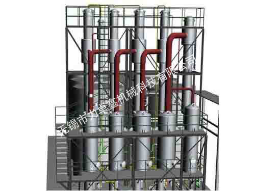 工作原理:四效降膜蒸發器需濃縮的料液由泵送入加熱管頂部,沿著加熱管內壁形成液膜向下流動。在這個過程中,由于管外的加熱,管內液膜開始沸騰并部分蒸發